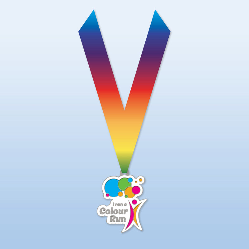 Made from enamel with colourful polished front and satin rainbow ribbon, our bright and affordable medal is the perfect addition to your colour run package.